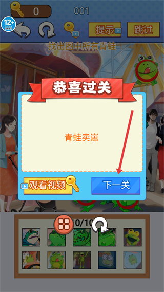 4、收集完所有青蛙后顯示【恭喜過關(guān)】,點擊【下一關(guān)】按鈕,挑戰(zhàn)新的找茬關(guān)卡。