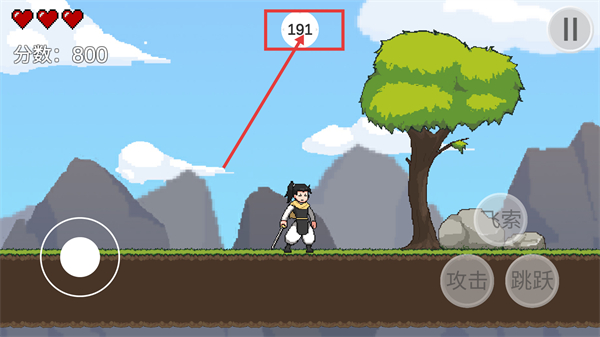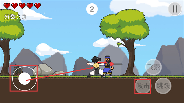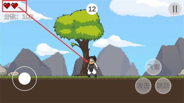 1、戰(zhàn)斗時利用左側(cè)【移動輪盤】控制角色走位,配合【攻擊】鍵擊打敵人,注意上方【愛心-生命】數(shù)量,避免耗盡。