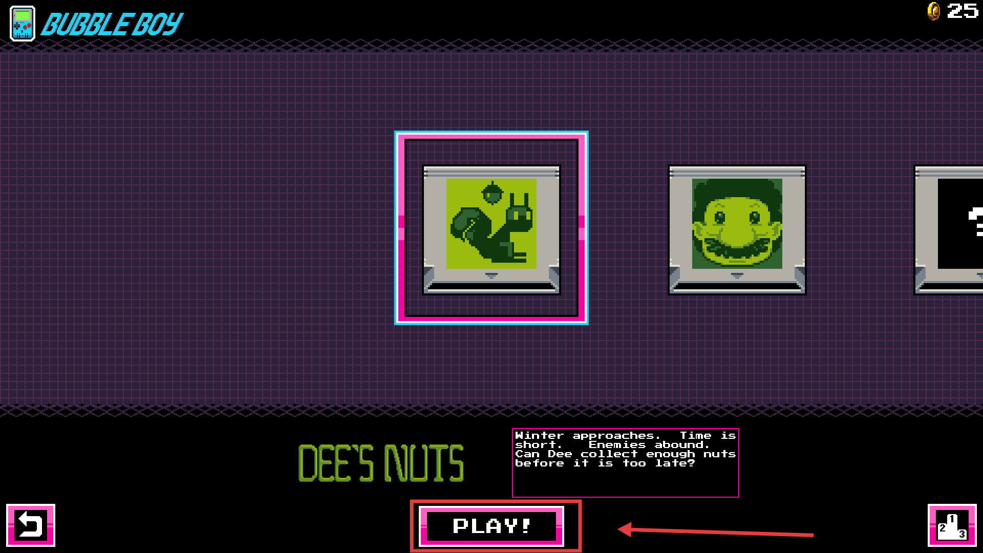 1、在主界面選擇【DEE'S-NUTS】模式,點(diǎn)擊粉色邊框的【PLAY!】按鈕開始冒險(xiǎn)。