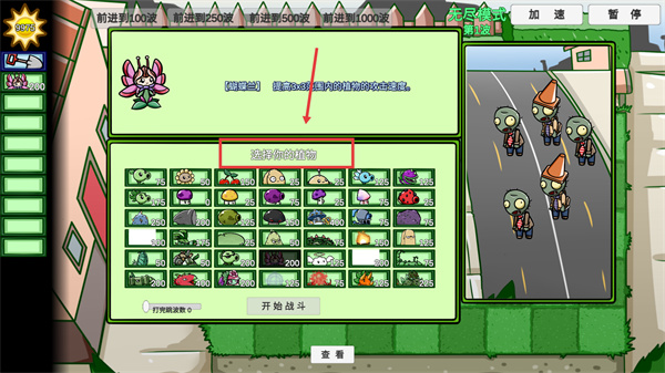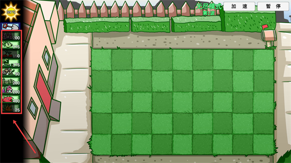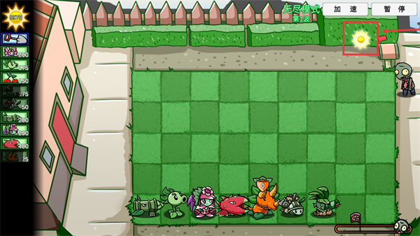 2、進(jìn)入戰(zhàn)斗后,左側(cè)會(huì)顯示已選植物的冷卻與消耗,需合理規(guī)劃種植位置,優(yōu)先在靠近僵尸路徑的格子布局輸出植物。
