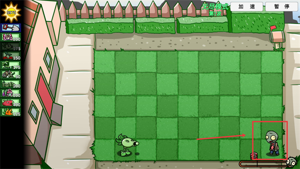 3、戰(zhàn)斗中先在僵尸行進(jìn)路徑前種植輸出植物,快速攔截第一波僵尸,避免其靠近房屋。