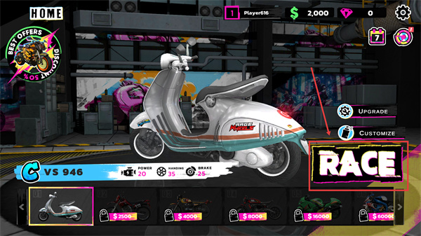 1、在主界面點擊【RACE】進入比賽,可先通過【UPGRADE】升級當前車輛屬性,提升比賽中的基礎(chǔ)性能。