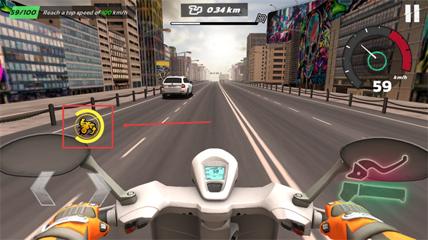 3、觸發(fā)左側(cè)【摩托標識】的增益效果,可使用特技技能,同時注意躲避前方車輛。