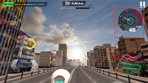 4、關(guān)注右上角【速度表】的數(shù)值變化,根據(jù)當前速度調(diào)整節(jié)奏,穩(wěn)步向100km/h的極速目標推進。