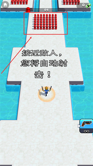 2、靠近敵人后,角色會自動射擊敵方單位,清理路徑上的敵人,向關(guān)卡目標(biāo)前進(jìn)。