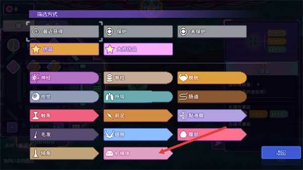 4、利用篩選功能選擇【神經(jīng)】【機(jī)械體】等不同類(lèi)型器官,優(yōu)化流派搭配提升戰(zhàn)斗效率。