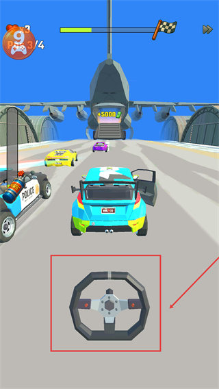 2、對(duì)局中通過【方向盤】控制車輛方向,靠近【+5000】標(biāo)識(shí)可獲取金幣,同時(shí)注意避讓其他車輛。
