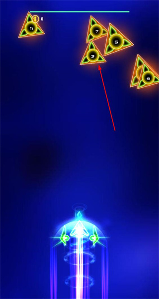 2、進(jìn)入關(guān)卡后,屏幕上方出現(xiàn)帶有數(shù)字的三角形敵人,戰(zhàn)機(jī)位于下方,需操控戰(zhàn)機(jī)攻擊這些敵人來推進(jìn)游戲。