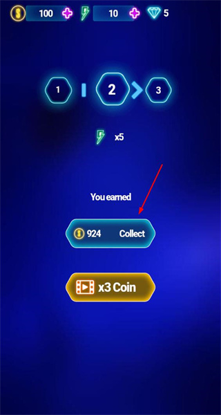 4、通關(guān)后,界面顯示獲得924金幣和5能量,可點(diǎn)擊按鈕領(lǐng)取獎(jiǎng)勵(lì),也能觀看視頻獲取三倍金幣獎(jiǎng)勵(lì)。