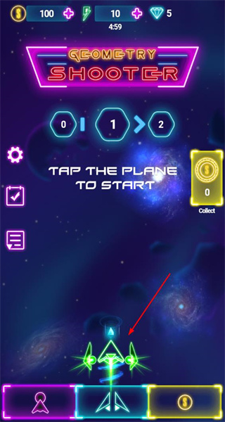 1、打開幾何射擊游戲,當(dāng)前處于第1關(guān),點(diǎn)擊戰(zhàn)機(jī)即可開始游戲,上方顯示擁有100金幣10能量5鉆石。