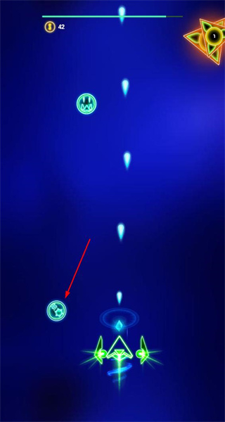 3、敵人被擊中后出現(xiàn)金幣等獎(jiǎng)勵(lì)道具,玩家可移動(dòng)戰(zhàn)機(jī)來獲取道具,這些道具可提升收益,助力玩家挑戰(zhàn)。
