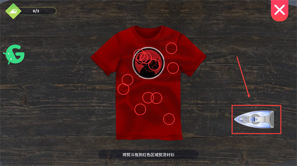 1、使用右側(cè)的熨斗工具,對準(zhǔn)衣物的褶皺地方熨燙,完成衣物處理環(huán)節(jié)。