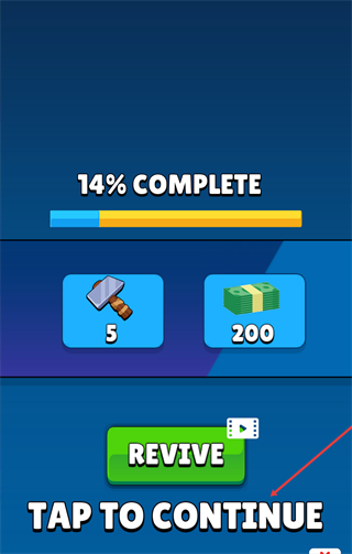 4、當(dāng)關(guān)卡進(jìn)度達(dá)【14%COMPLETE】時(shí)進(jìn)入階段結(jié)算界面,點(diǎn)擊【TAPTOCONTINUE】按鈕,即可繼續(xù)后續(xù)的關(guān)卡操作。