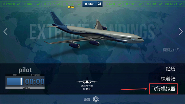 1、進入游戲界面后,可選擇【R-344P】機型,查看【TRAINEE】等級與飛行數(shù)據(jù),點擊【飛行模擬器】進入模擬飛行模式。