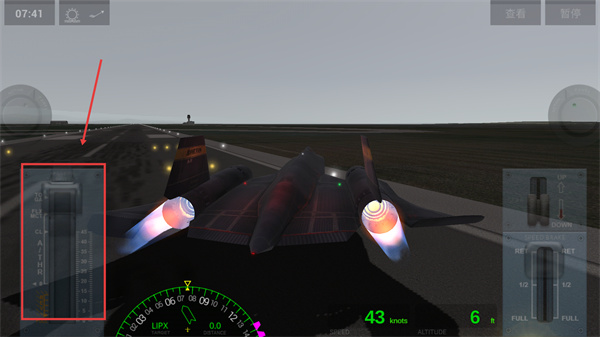 4、滑行階段通過油門滑塊調(diào)整動力,關(guān)注【43-knots】速度與【6-ft】高度,配合減速板控制滑行狀態(tài)為起飛做準備。