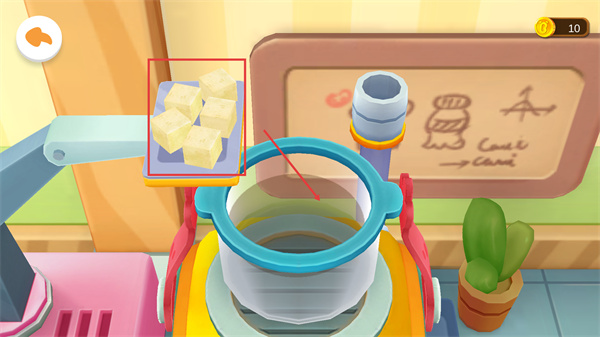 1、制作流程初始階段,將【方塊食材】放入容器中,這是菜品制作的基礎(chǔ)原料投放步驟,需準(zhǔn)確完成。