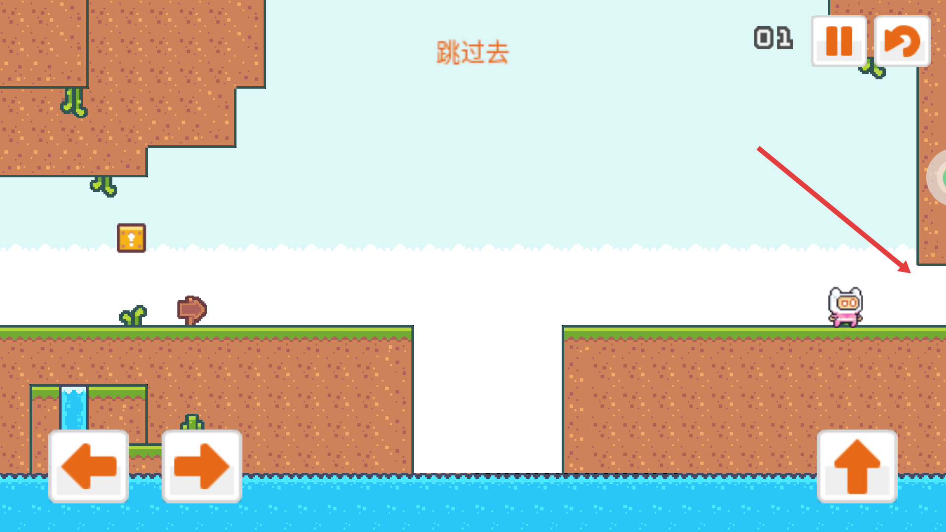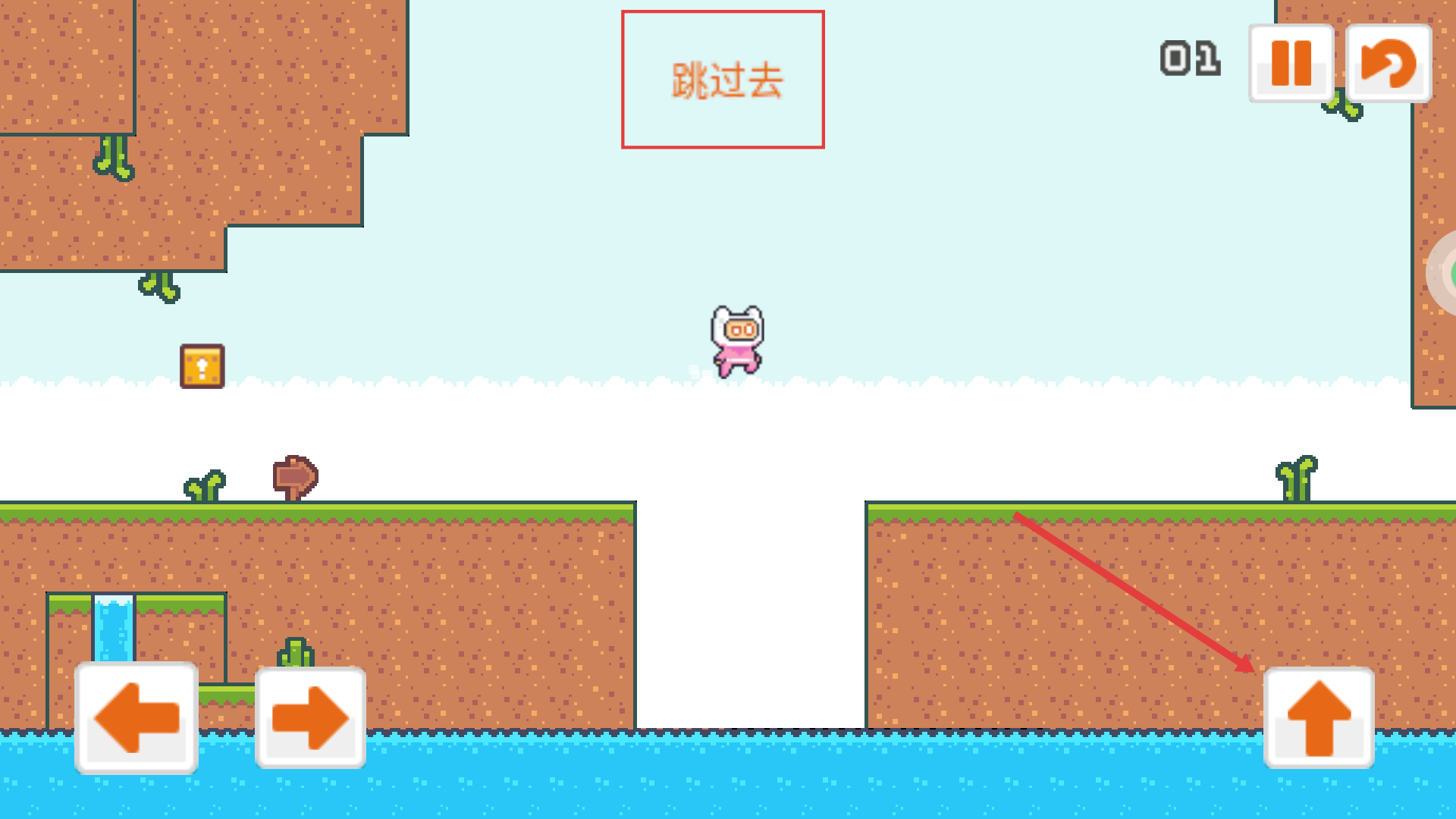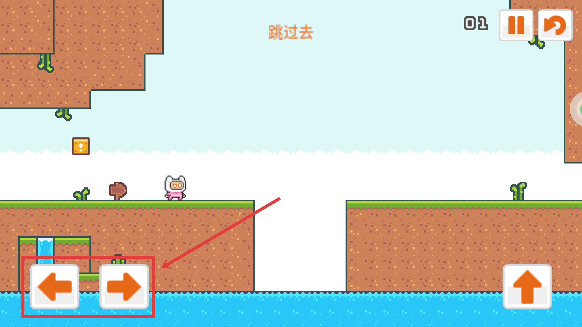 2、進(jìn)入關(guān)卡后,通過(guò)左右方向鍵控制角色移動(dòng),界面提示“跳過(guò)去”,需操控角色移動(dòng)到平臺(tái)邊緣,為跳躍做準(zhǔn)備。