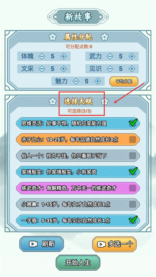 1、進行【屬性分配】后,在【選擇天賦】中挑選3個天賦,助力開局發(fā)展。