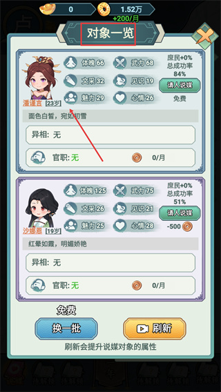 2、打開【對象一覽】,查看角色屬性與說媒成功率,選擇【免費】說媒對象。
