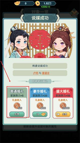 3、說媒成功后,選擇【普通婚禮】可免費獲得【家族勢力+5】與【禮金收入-500】,是初期性價比之選。