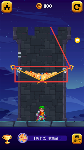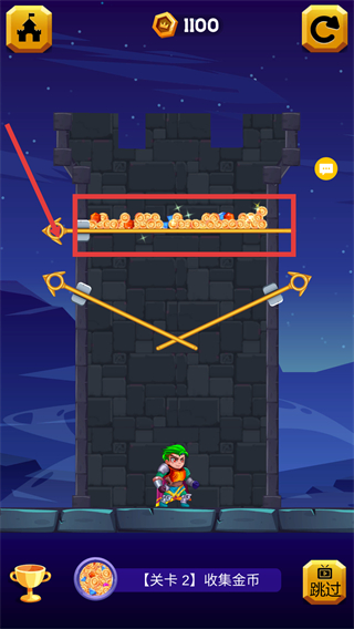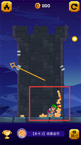1、進(jìn)入關(guān)卡收集金幣時(shí),先拉開(kāi)左側(cè)拉針,讓金幣和寶石沿橫桿落下,為后續(xù)收集做準(zhǔn)備。