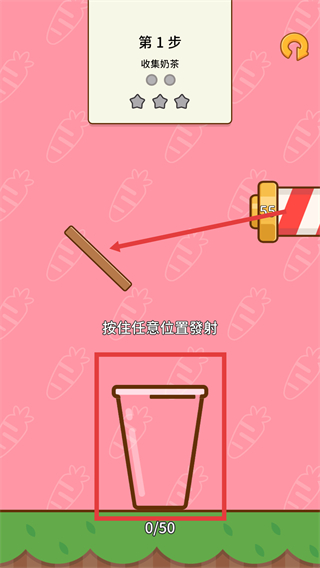 2、進(jìn)入收集【奶茶】環(huán)節(jié),按住任意位置使用【發(fā)射裝置】,將奶茶精準(zhǔn)倒入下方【杯子】中。