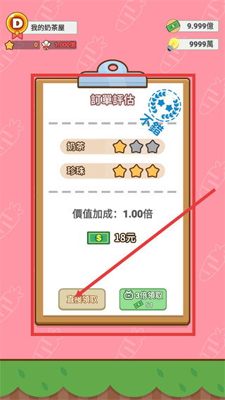 4、訂單制作完成后查看【訂單評估】,奶茶和珍珠獲得星級評分,點擊【直接領(lǐng)取】獲取18元獎勵。