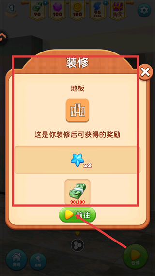 1、裝修界面選擇地板,消耗金錢可獲星星與鈔票獎(jiǎng)勵(lì),點(diǎn)擊前往推進(jìn)裝修流程。