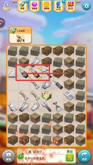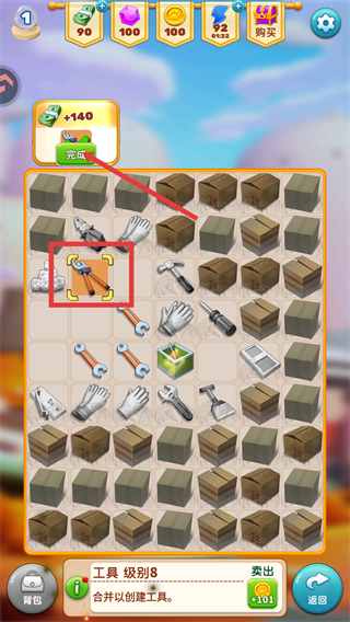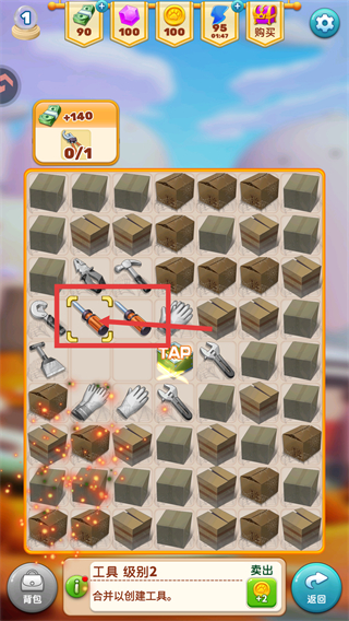 3、消除關(guān)卡里將相同【鉗子】拖動(dòng)合并,提升工具等級(jí),快速達(dá)成任務(wù)進(jìn)度獲取獎(jiǎng)勵(lì)。