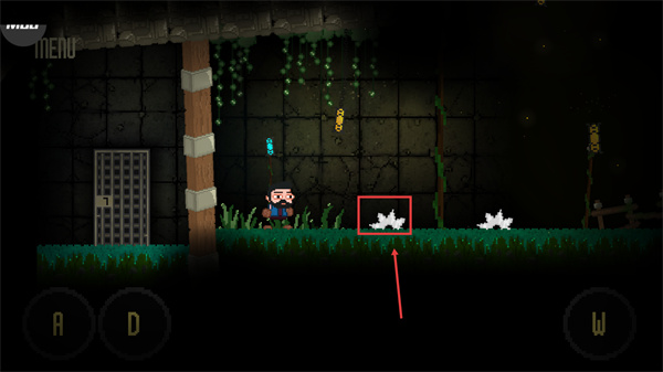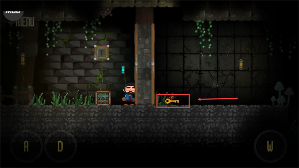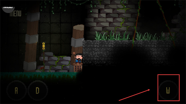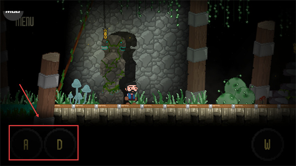 1、通過【A】-【D】按鍵控制角色左右移動,在洞穴場景中先探索當(dāng)前平臺區(qū)域,留意周圍可互動的元素。