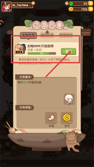 1、完成主線升級(jí)廚師任務(wù),需將主廚升級(jí)至4級(jí),點(diǎn)擊界面【前往】按鈕推進(jìn)任務(wù)進(jìn)度。