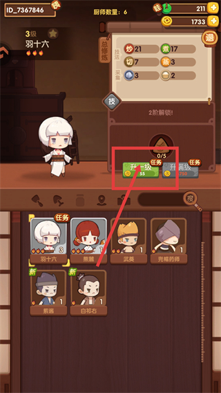 2、在廚師養(yǎng)成界面選中廚師,點(diǎn)擊【升一級(jí)】按鈕,消耗55金幣提升廚師等級(jí)推進(jìn)任務(wù)。