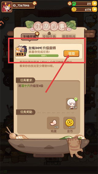 3、主線升級(jí)廚師任務(wù)完成后,點(diǎn)擊界面【領(lǐng)取】按鈕,即可獲取雞蛋與金幣獎(jiǎng)勵(lì)。