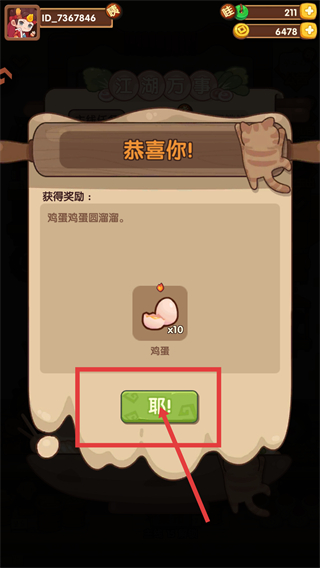 4、完成任務(wù)領(lǐng)取獎(jiǎng)勵(lì)后彈出獎(jiǎng)勵(lì)界面,點(diǎn)擊按鈕即可獲得【雞蛋】的獎(jiǎng)勵(lì)。