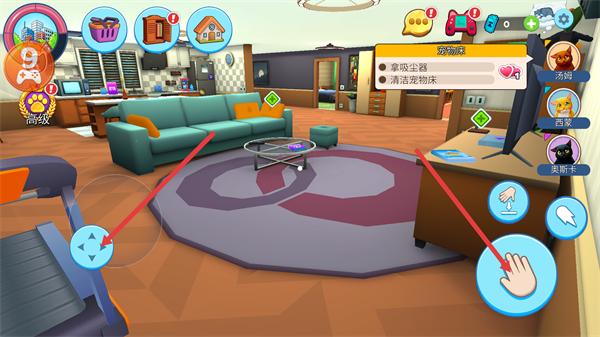 1、通過點(diǎn)擊移動(dòng)按鈕滿足貓咪需求,清潔貓窩保持環(huán)境整潔,日常陪伴提升與貓咪的親密度。