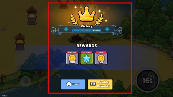 4、通關(guān)后會顯示勝利界面,可領(lǐng)取首次通關(guān)與額外獎勵,選擇返回主頁結(jié)束關(guān)卡,或看視頻拿雙倍獎勵,積累獎勵解鎖更多內(nèi)容。