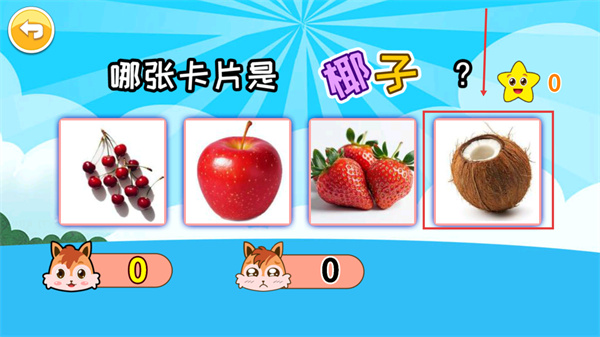 2、選擇被框選的【椰子卡片】完成題目,這類題目需識別指定水果。