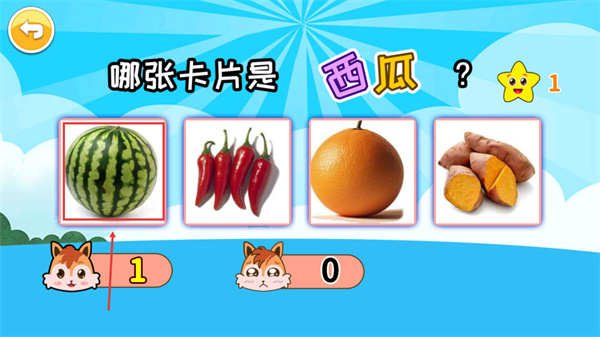 3、點擊被框選的【西瓜卡片】,選對后可提升左側(cè)得分至【1】。