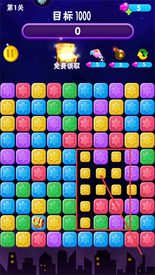 2、第1關(guān)目標(biāo)為【1000】分,優(yōu)先消除同色星星堆(如集中的黃色星星),可快速積累分?jǐn)?shù)推進(jìn)進(jìn)度。