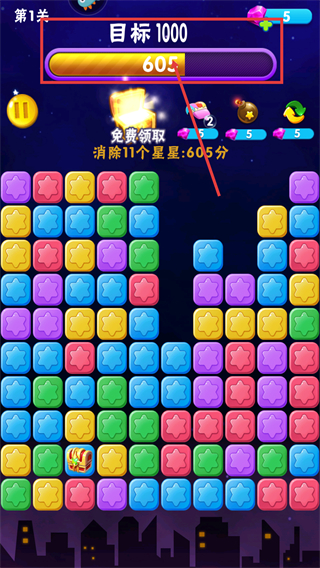 3、消除【11個(gè)星星】可獲得【605分】,需持續(xù)組合同色星星,同時(shí)關(guān)注進(jìn)度條,接近目標(biāo)時(shí)合理規(guī)劃消除。