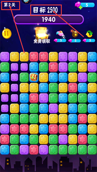 4、進(jìn)入【第2關(guān)】后,目標(biāo)提升至【2500】分,需更高效組合多組同色星星,同時(shí)利用道具助力分?jǐn)?shù)積累。