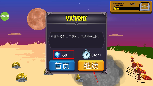 4、獲勝后獲得【68】鉆石獎勵,點擊【繼續(xù)】進入下一關(guān)。