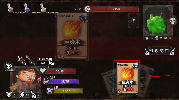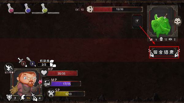 4、合理釋放卡牌后點(diǎn)擊【回合結(jié)束】,應(yīng)對(duì)綠色怪物攻擊,積累潛力點(diǎn)提升等級(jí),逐步推進(jìn)地牢關(guān)卡進(jìn)度。