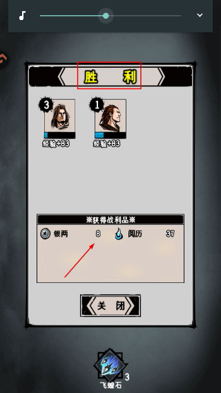 4、戰(zhàn)斗勝利后可獲得【銀兩】與【閱歷】獎(jiǎng)勵(lì),點(diǎn)擊【關(guān)閉】按鈕結(jié)束結(jié)算,繼續(xù)探索江湖完成更多冒險(xiǎn)任務(wù)。