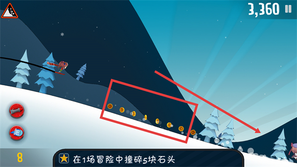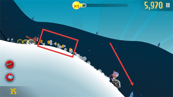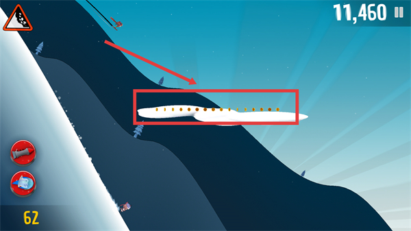 1、滑雪中盡量收集【金幣】,注意避開障礙,同時(shí)留意雪崩警告標(biāo)志,保持滑行節(jié)奏以積累初始分?jǐn)?shù)。