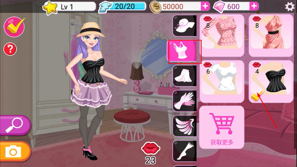3、通過右側(cè)【獲取更多】按鈕解鎖新服飾,選擇【黑色上衣】能打造個性裝扮,提升角色魅力。