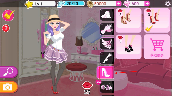 4、點擊右側(cè)【紅色高跟鞋】完成鞋履搭配,再點左上角【對勾】確認裝扮,推進游戲進程。