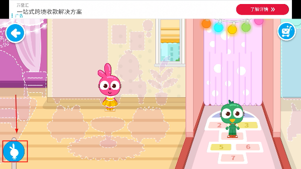 1、點(diǎn)擊【藍(lán)色兔子】圖標(biāo),選擇喜歡的角色,開始為房間里的虛線圖案填充顏色,打造專屬小屋。