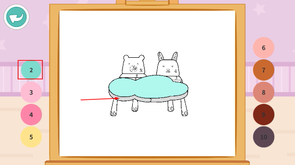 2、選中左側(cè)【數(shù)字2】按鈕,再點(diǎn)擊右側(cè)對應(yīng)顏色,為小熊和兔子圖案的部分區(qū)域填充顏色,讓圖案更生動(dòng)。