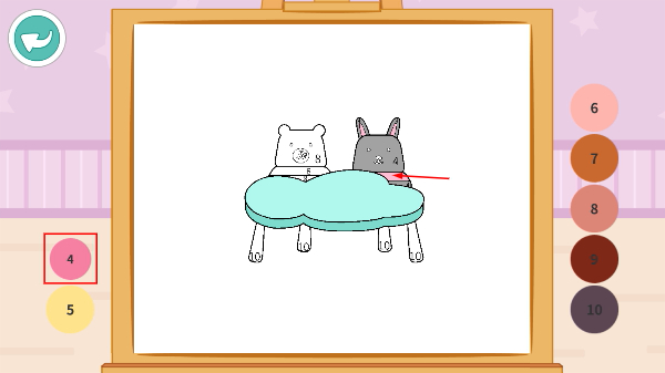 3、點(diǎn)擊左側(cè)【數(shù)字4】按鈕,選擇合適的顏色,為兔子角色的剩余部分填充,讓圖案逐步完整。